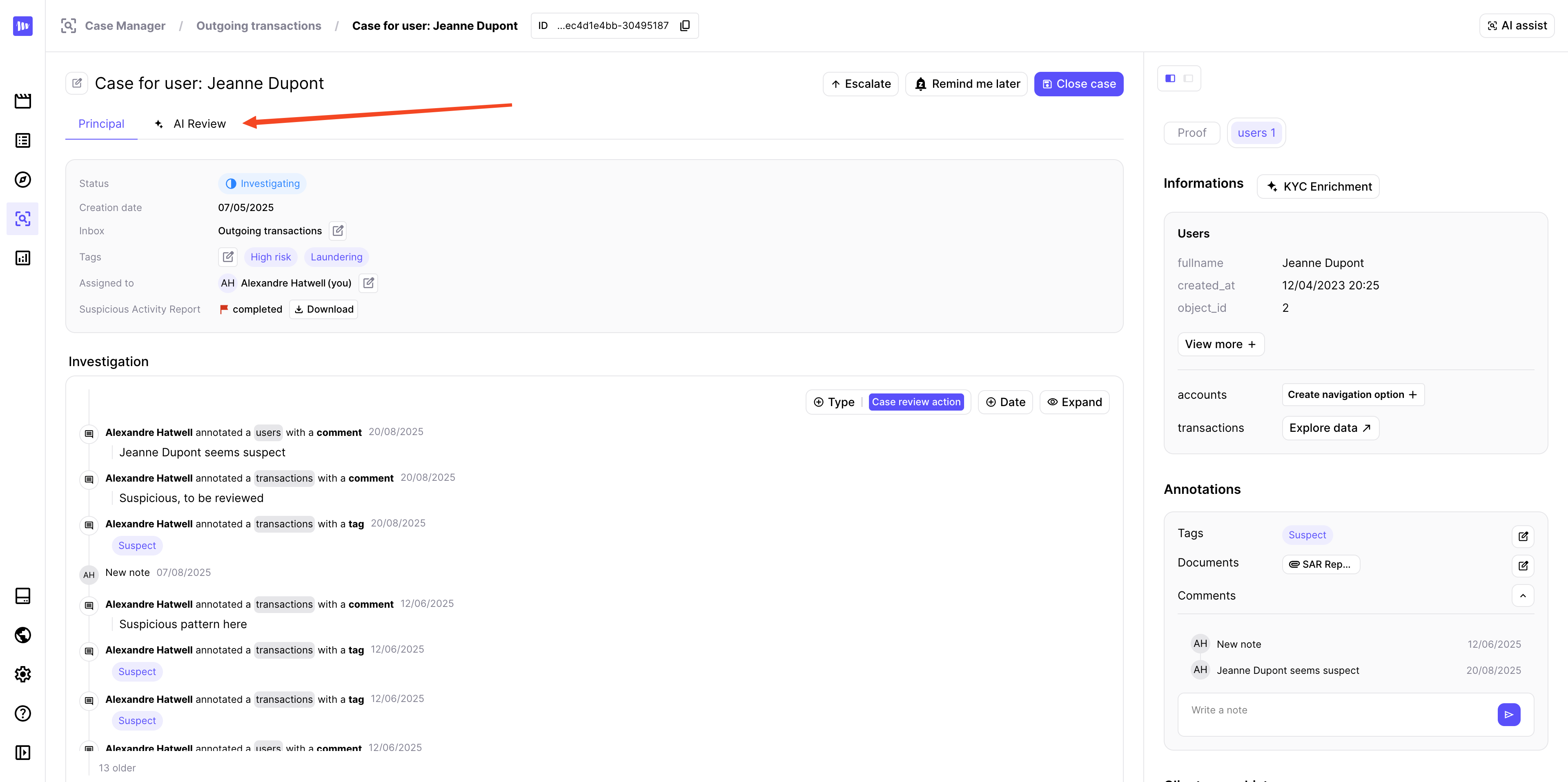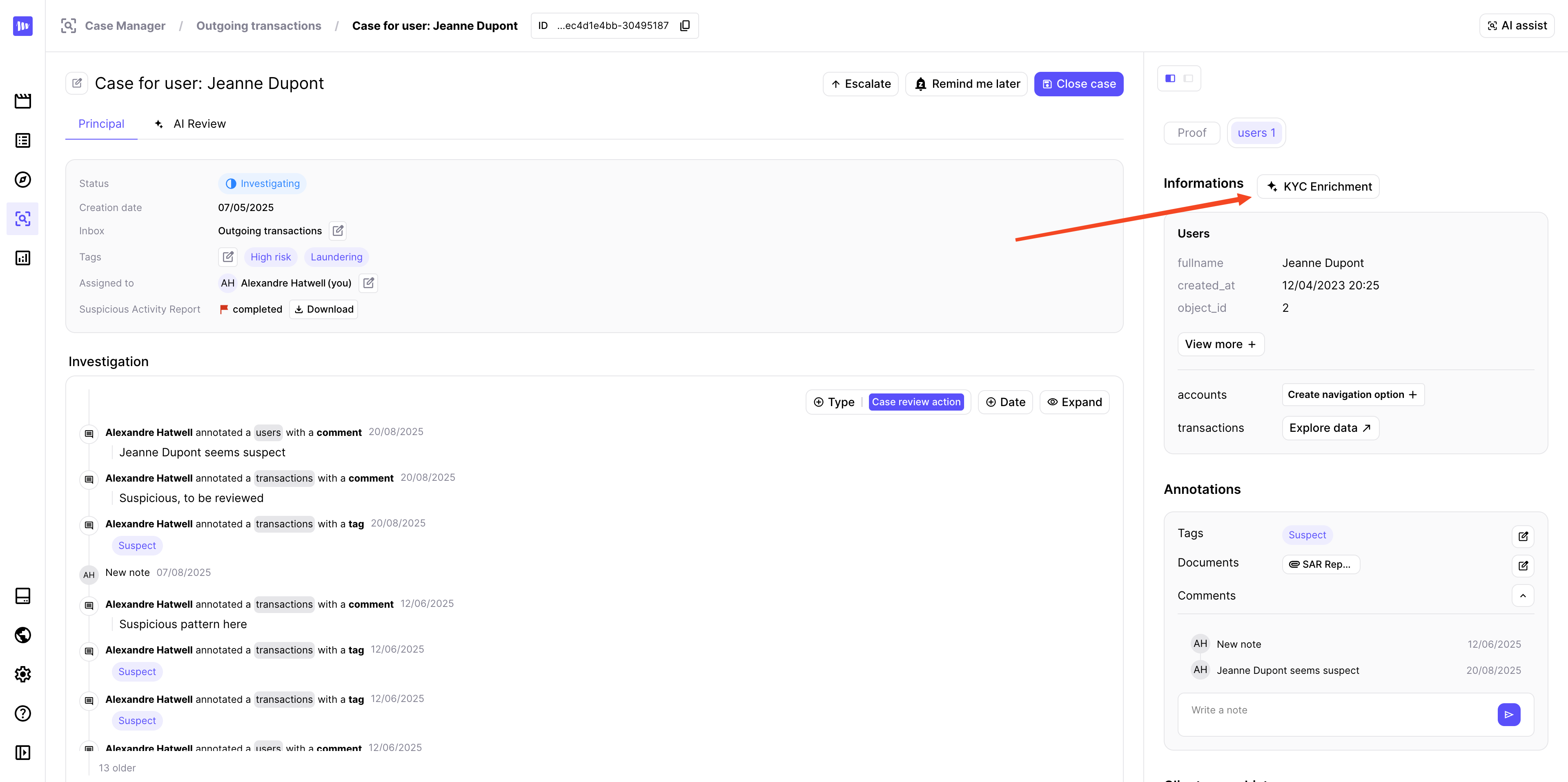 The Case Manager offers AI features that provide an automated review of created cases, as well as an enrichment of your KYC information. By analyzing alerts and related data, it identifies potential risks, highlights key insights, and delivers an initial opinion along with actionable recommendations. This helps investigators save time and focus on the most critical aspects of each case.