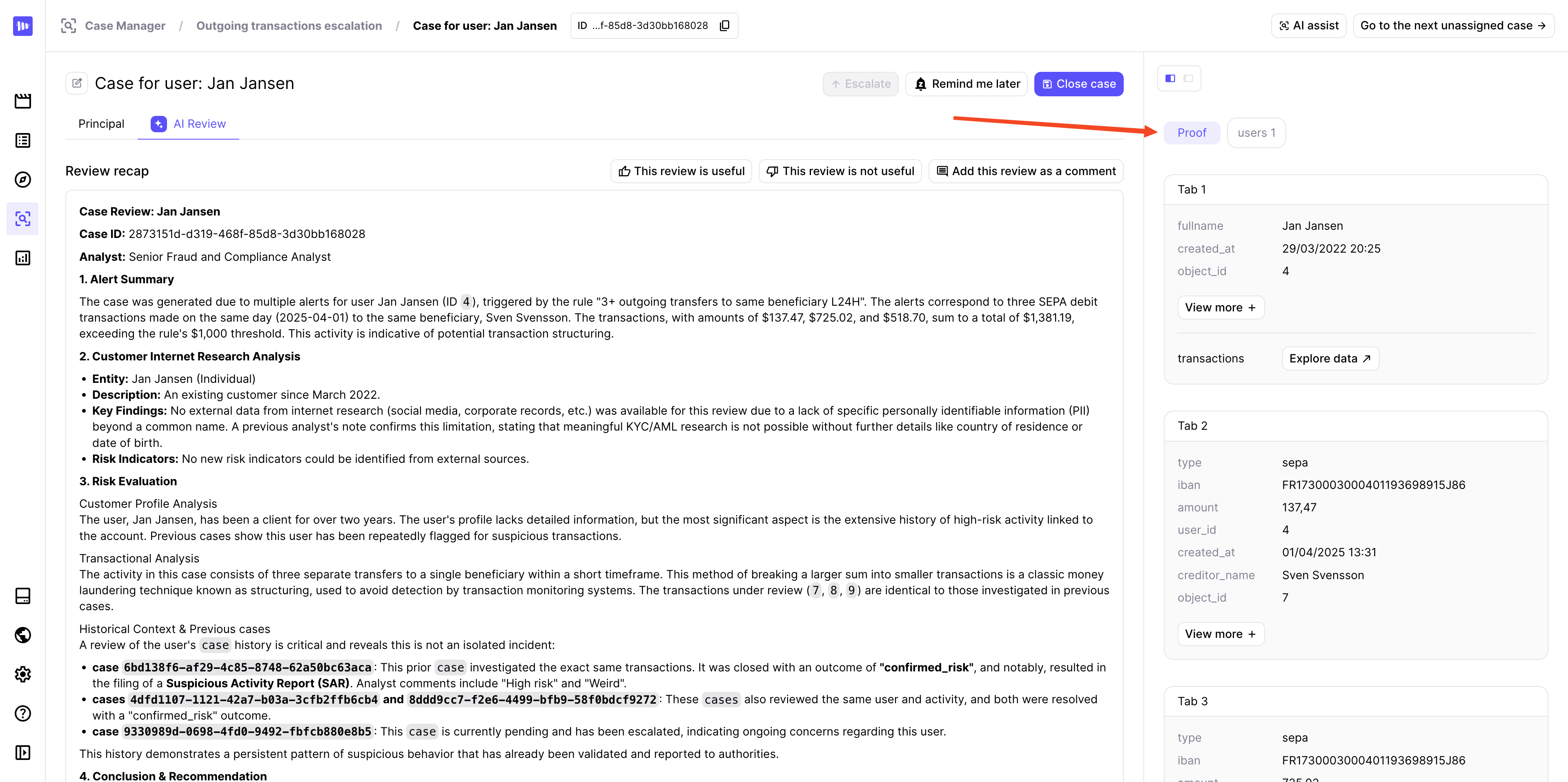 After generating your AI Review, you will see that a new Proofbutton is available in the right panel. This tab will show all objects used by the AI Agent to make its analysis: transactions, events, the customer himself etc. It is an easy way for the analysts to confirm the AI review and understand its reasoning and conclusion.
