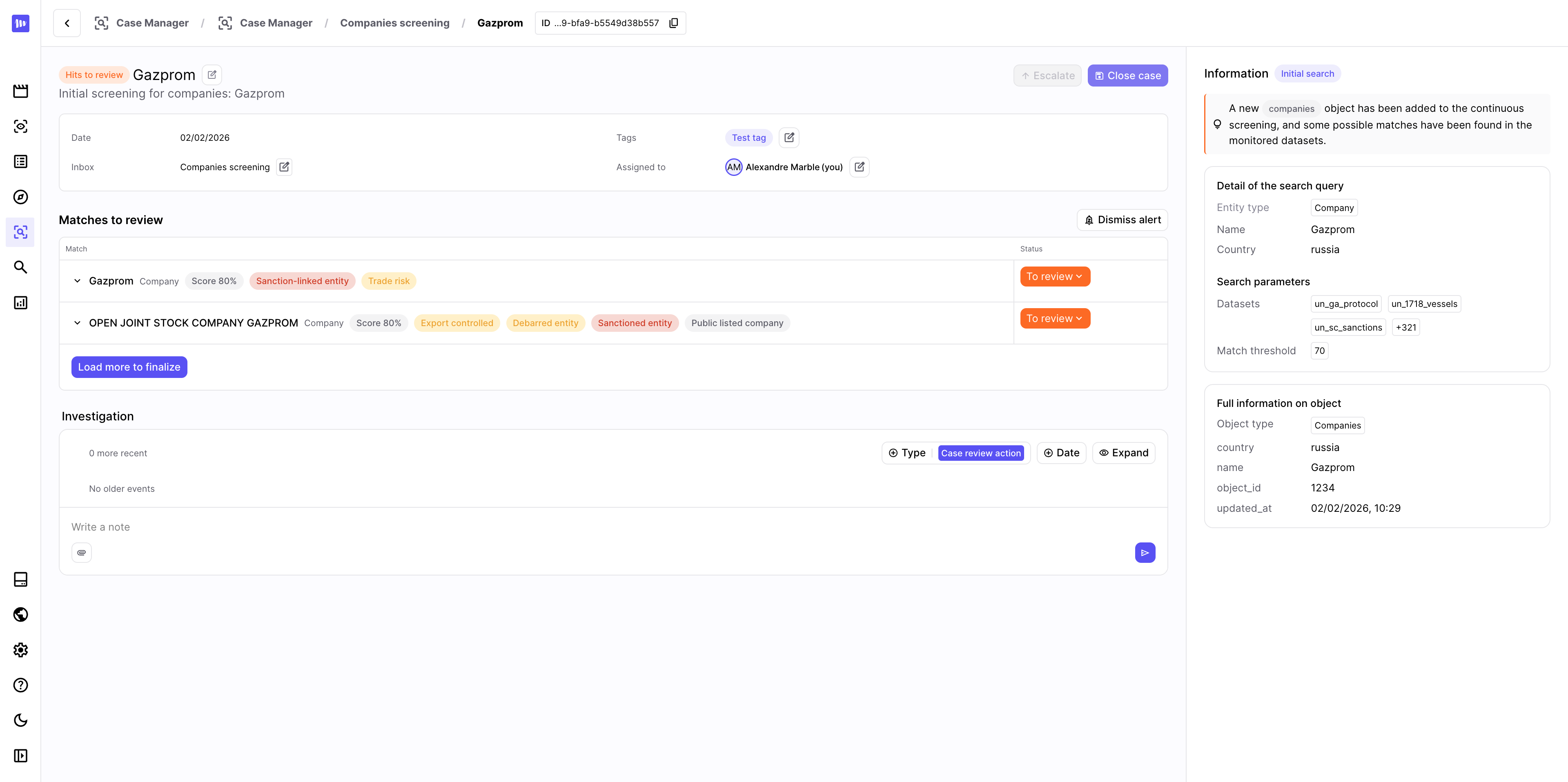 When a continuous screening alert is created, a dedicated case will automatically be created in the inbox you selected in your configuration.
