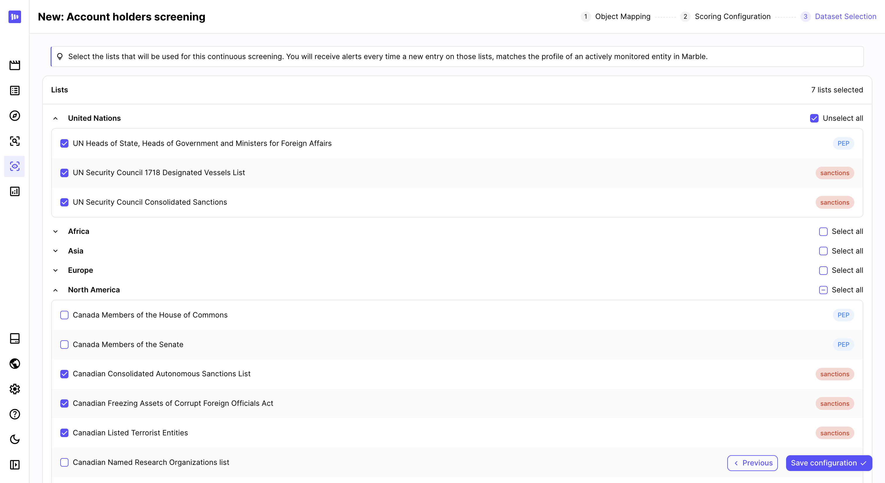 Once your scoring configuration done, the last step is to select the lists against which your will screen your customer base.