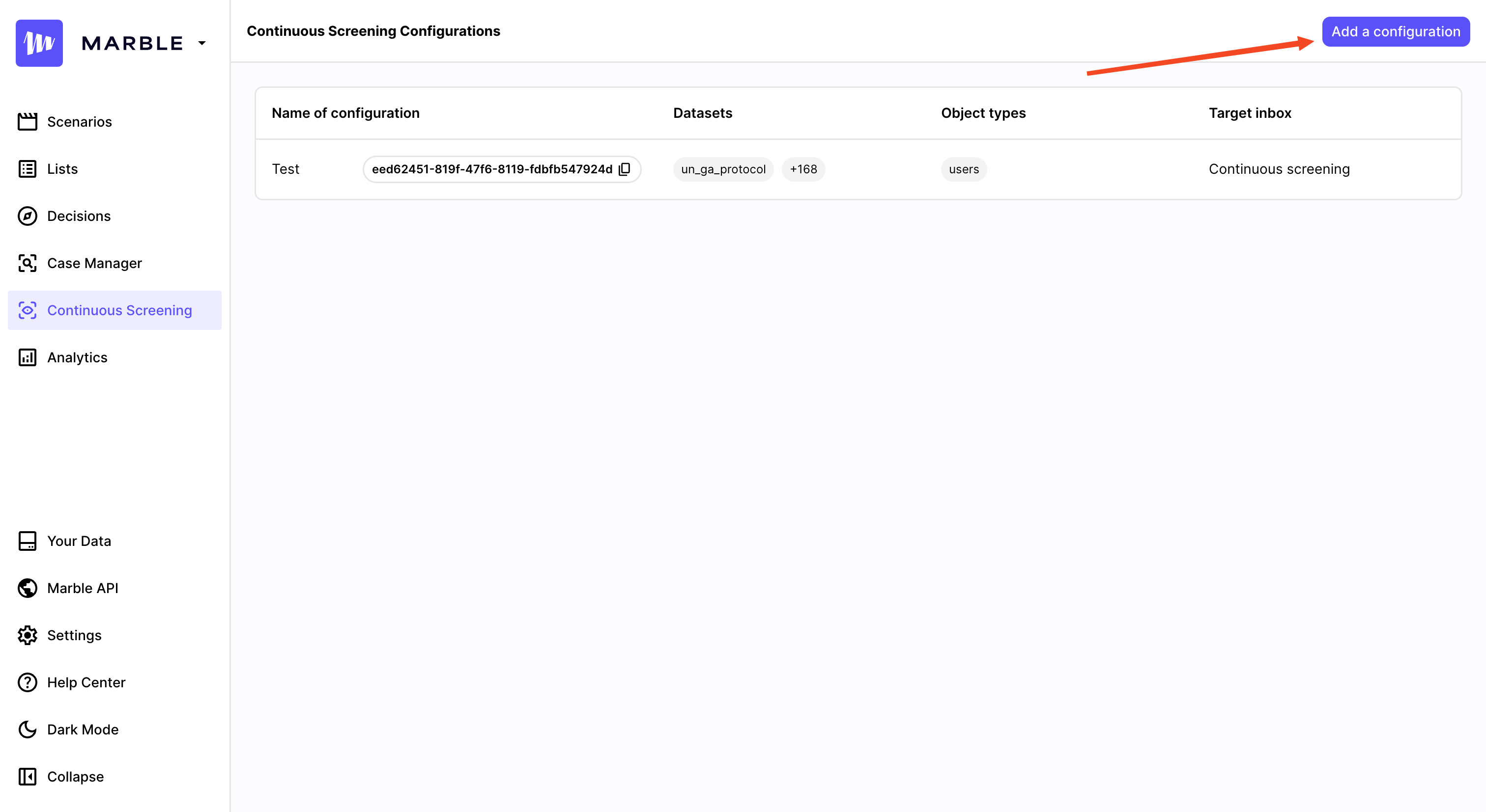 You can access the feature by clicking on the Continuous screening button in the left menu. You will then see the list of your existing continuous screenings.