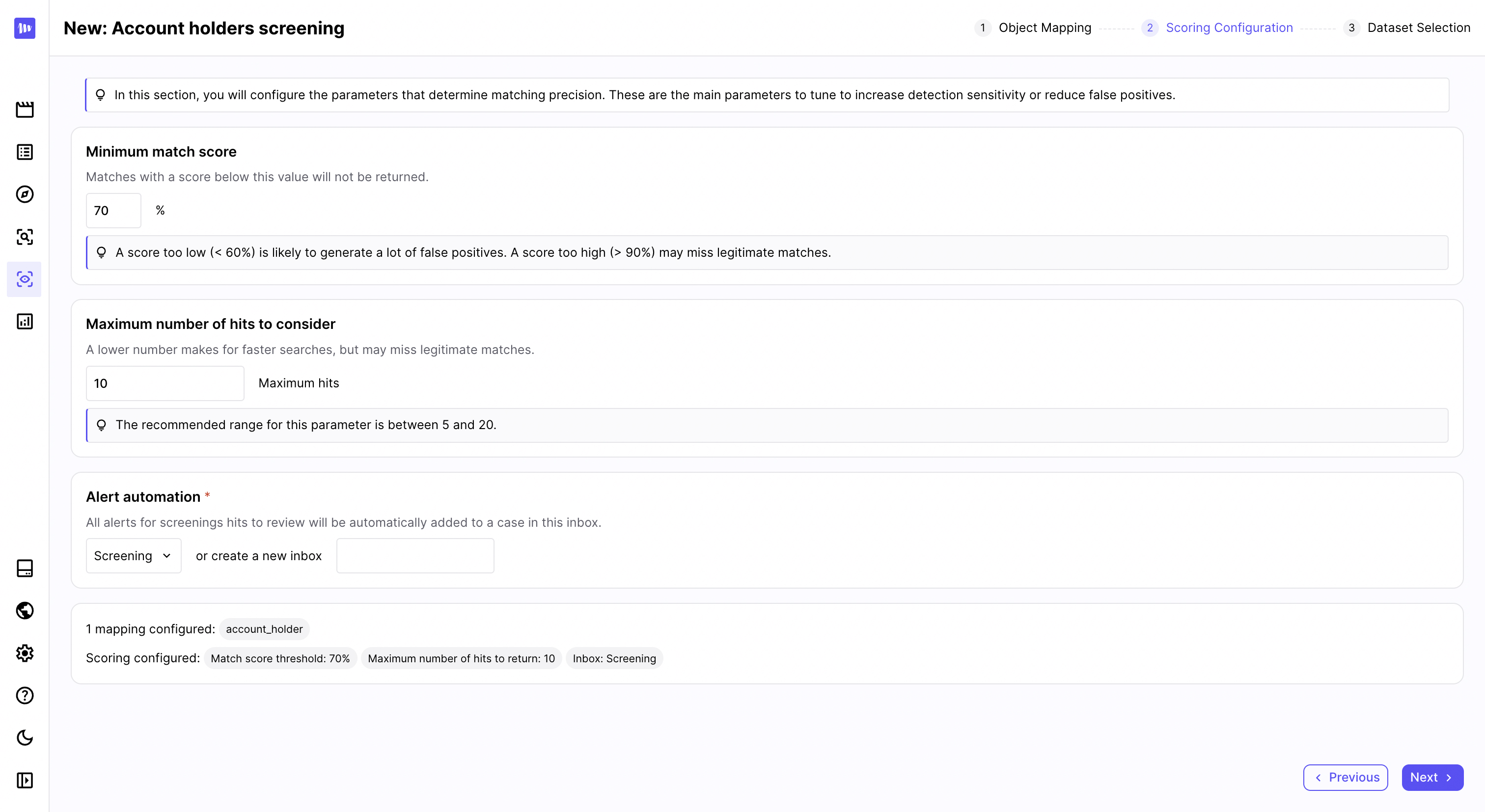 - Minimum match score: it is the entity matching threshold from which alerts will be triggered. A score too low (< 60%) is likely to generate a lot of false positives. A score too high (> 90%) may miss legitimate matches.