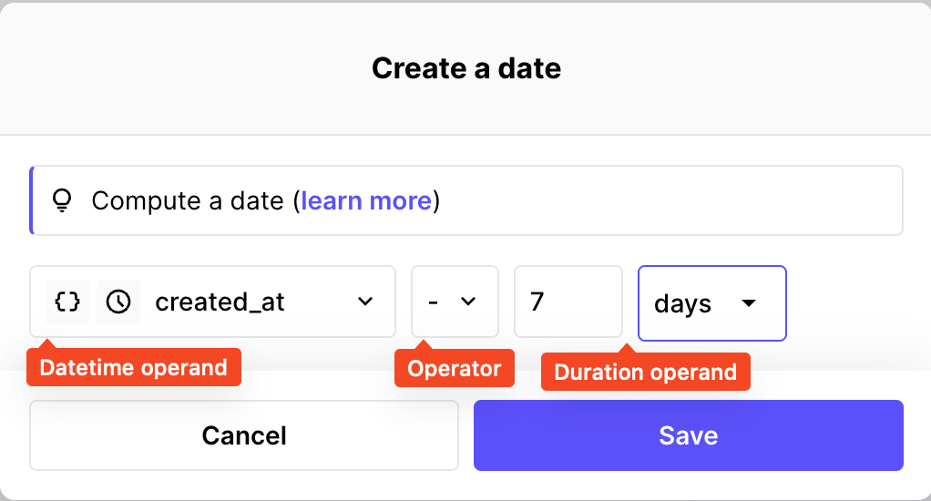 - Date: This function modifies a datetime field by adding or subtracting a specified duration to return a new calculated date.