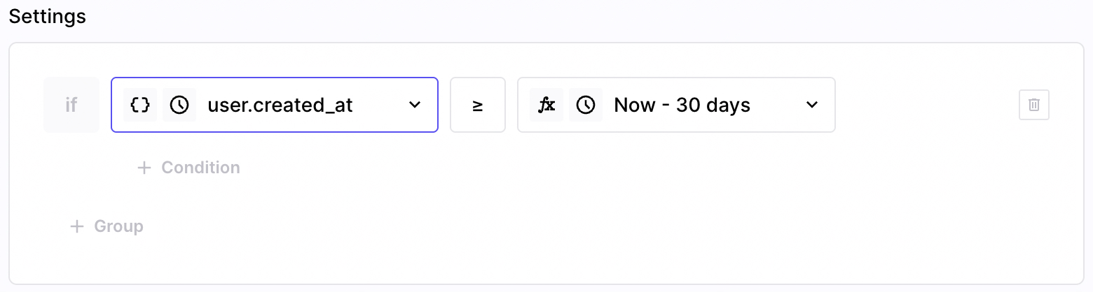 Let's say we have we want to build a rule that checks if the user was created in the last 30 days.