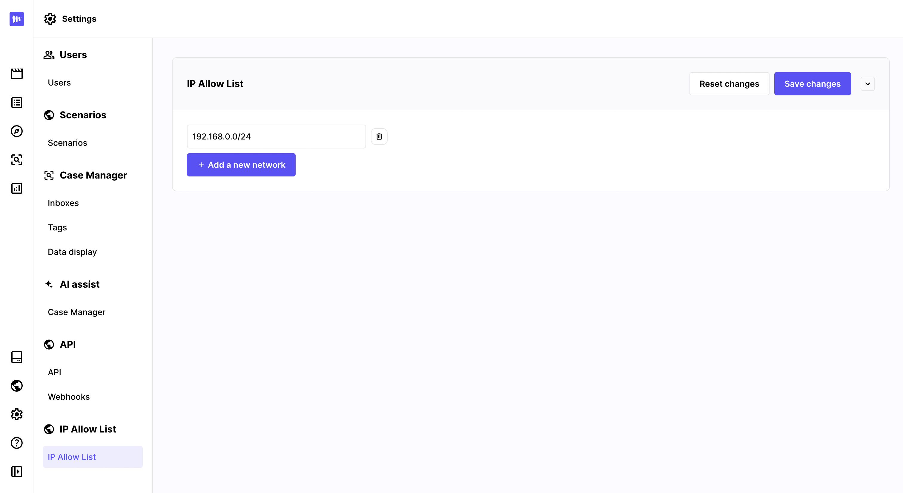 To use it, simply go to Settings → IP Allow List and add as many IPs as you need. Note that you need to add network addresses with their mask, such as 192.168.0.0/24.