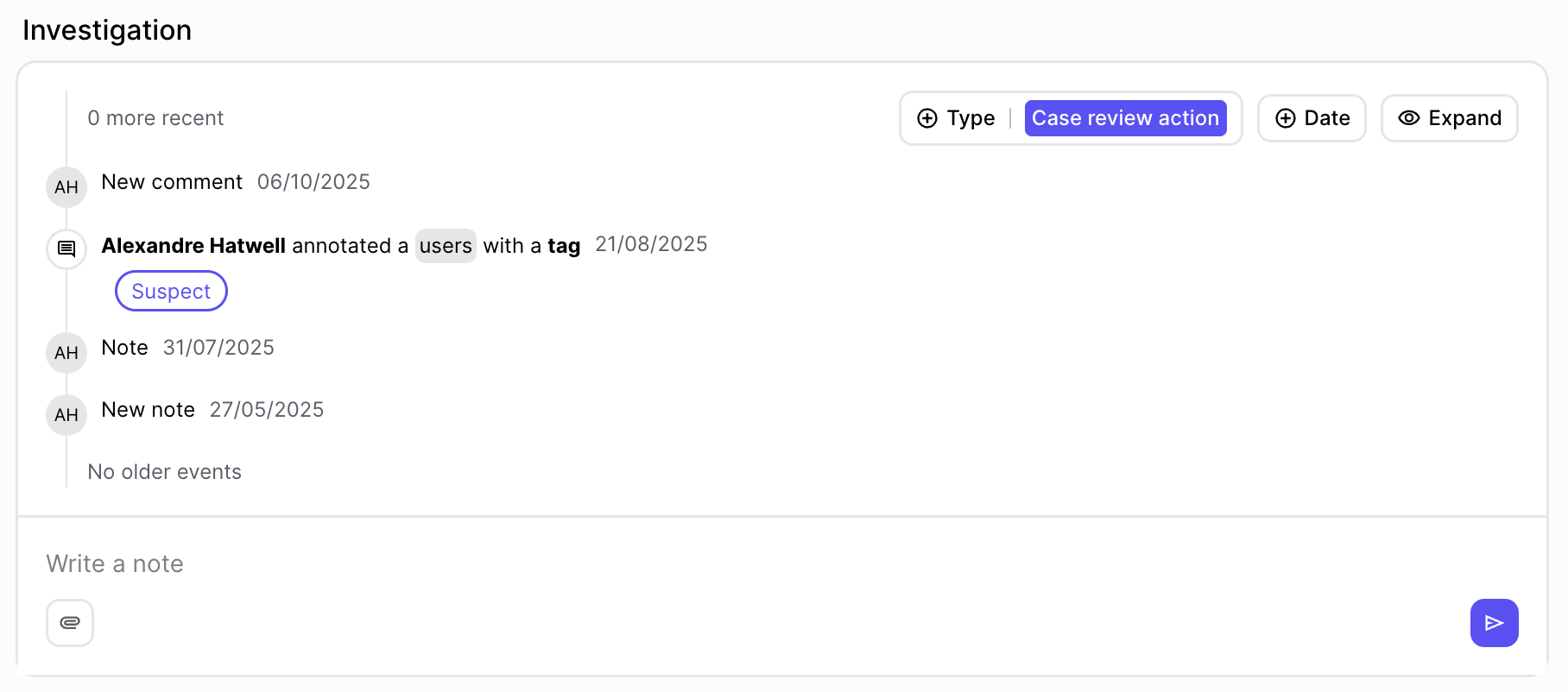 to the pivot, i.e. your user. These annotations will be visible both in the investigation timeline of the case, and in the right section of every other cases related to the same user.