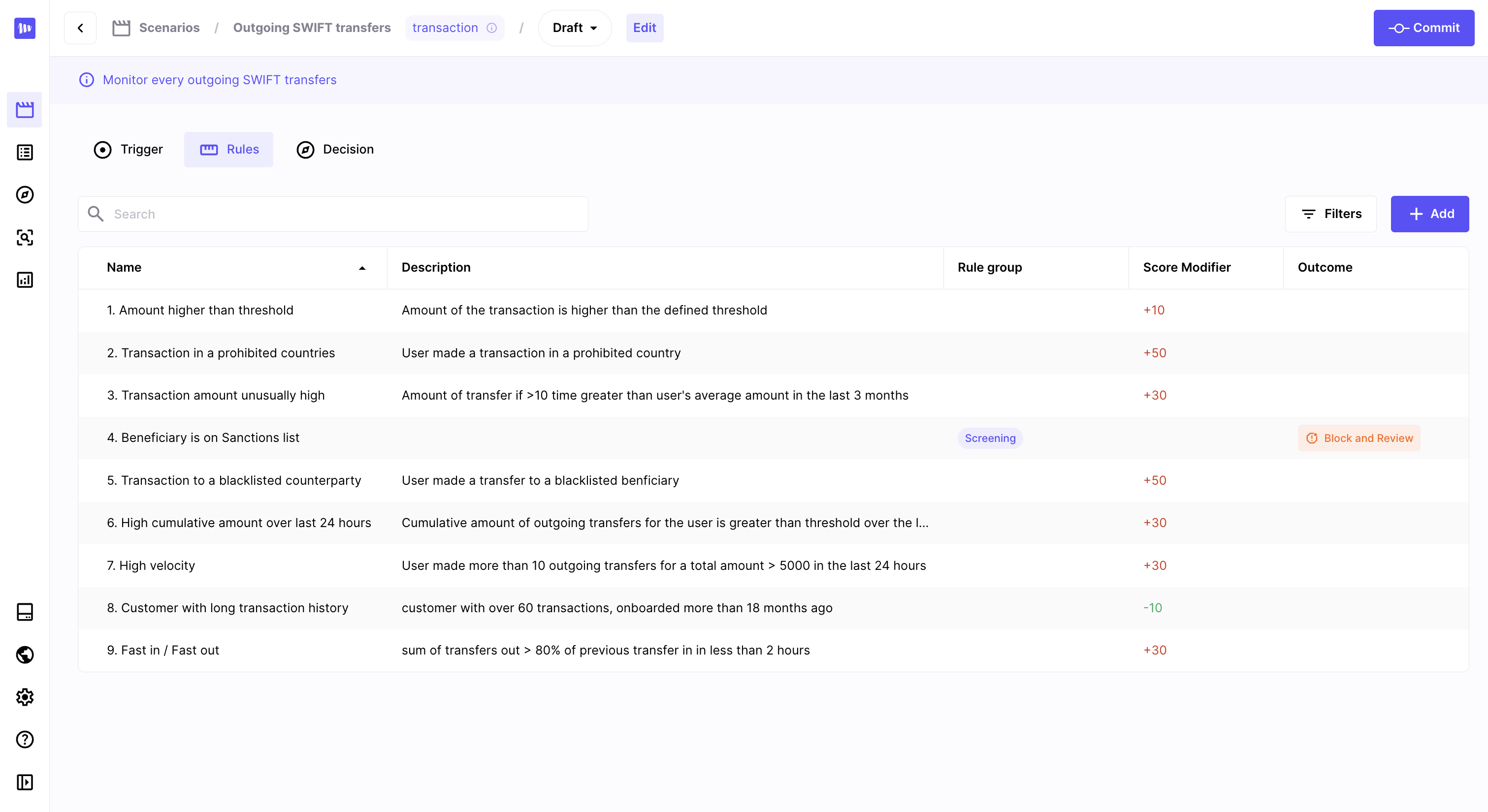 On the Rules tab you will see the scenario's list of rules, and you will be able to: