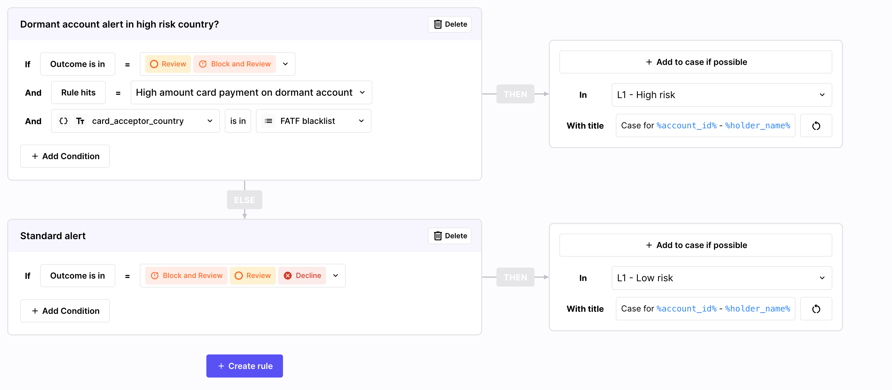 - The first rule will add the decision to an existing case in the L1 - High risk inbox, if any, when the decision's outcome is either Review or Block and review, the rule High amount card payment on dormant account hits and the card payment was made in a FATF country.